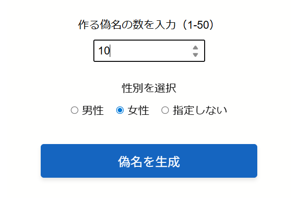 男性・女性・性別指定なしの3つのモードから、生成する偽名を選べます。