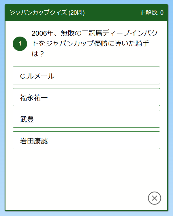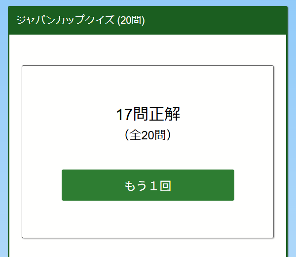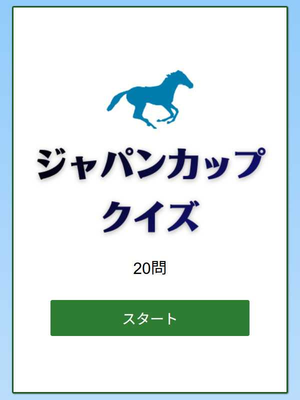 ジャパンカップに関するクイズを作りました。ランダムで20問出題されます。