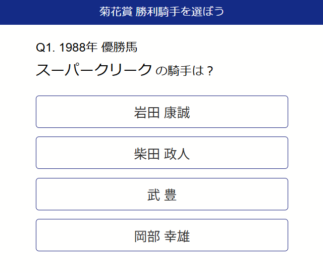 - 表示された菊花賞馬に騎乗した騎手を4人の中から選びます。