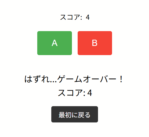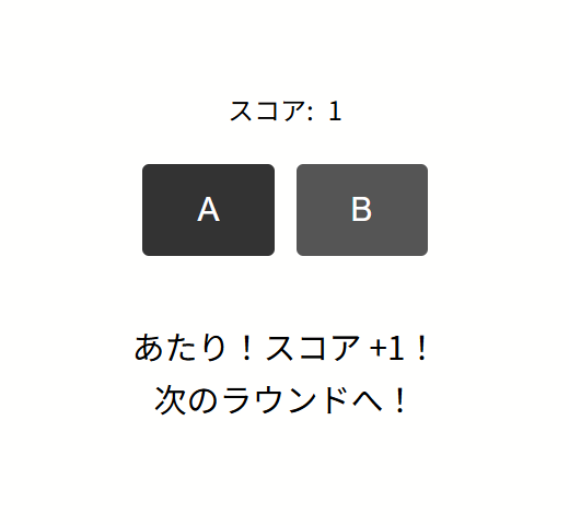 - 正解(当たり)の場合:スコアが1点加算され、当たりがランダムで入れ替わり次のラウンドが始まります。